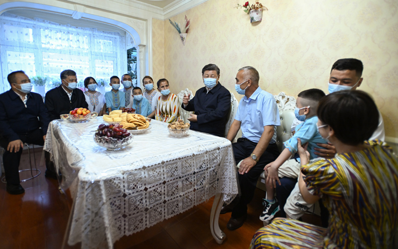 13日上午,習近平來到烏魯木齊市天山區(qū)固原巷社區(qū)。該社區(qū)少數(shù)民族居民占95%以上。習近平走進黨群服務中心大廳、愛心之家、舞蹈室、少兒閱覽室,同社區(qū)居民親切交流。習近平饒有興致觀看兒童中華優(yōu)秀傳統(tǒng)文化知識表演,他指出,中華優(yōu)秀傳統(tǒng)文化教育抓早抓小、久久為功、潛移默化、耳濡目染,有利于夯實傳承中華優(yōu)秀傳統(tǒng)文化的根基。在維吾爾族居民阿布來提·吐爾遜家中,習近平仔細察看客廳、臥室、廚房等,同一家人圍坐在一起拉家常。習近平強調,民族團結是我國各民族人民的生命線,新疆各民族都是中華民族大家庭不可分割的成員,要格外珍惜安定團結的大好局面,56個民族擰成一股繩,保持定力、腳踏實地,同心協(xié)力、踔厲奮發(fā),在黨的領導下為實現(xiàn)第二個百年奮斗目標繼續(xù)奮斗。習近平指出,社區(qū)工作連著千家萬戶,要充分發(fā)揮社區(qū)基層黨組織的戰(zhàn)斗堡壘作用,把工作重心下沉,緊貼各族居民所思所想所盼,幫助大家辦好事、辦實事、解難題,促進各族群眾手足相親、守望相助,共建美好家園、共創(chuàng)美好未來。