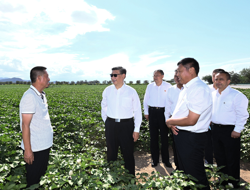7月12日至15日,中共中央總書記、國家主席、中央軍委主席習近平在新疆考察。這是13日下午,習近平在新疆生產建設兵團八師一四三團農一連棉花種植基地考察。新華社記者 謝環(huán)馳 攝