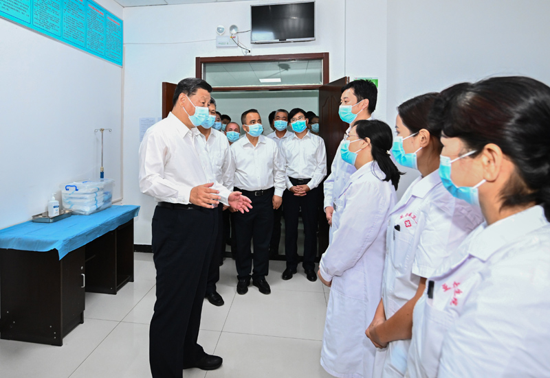 7月12日至15日,中共中央總書記、國家主席、中央軍委主席習近平在新疆考察。這是14日,習近平在吐魯番市高昌區(qū)亞爾鎮(zhèn)新城片區(qū)新城西門村黨群服務中心醫(yī)務室考察。新華社記者 燕雁 攝